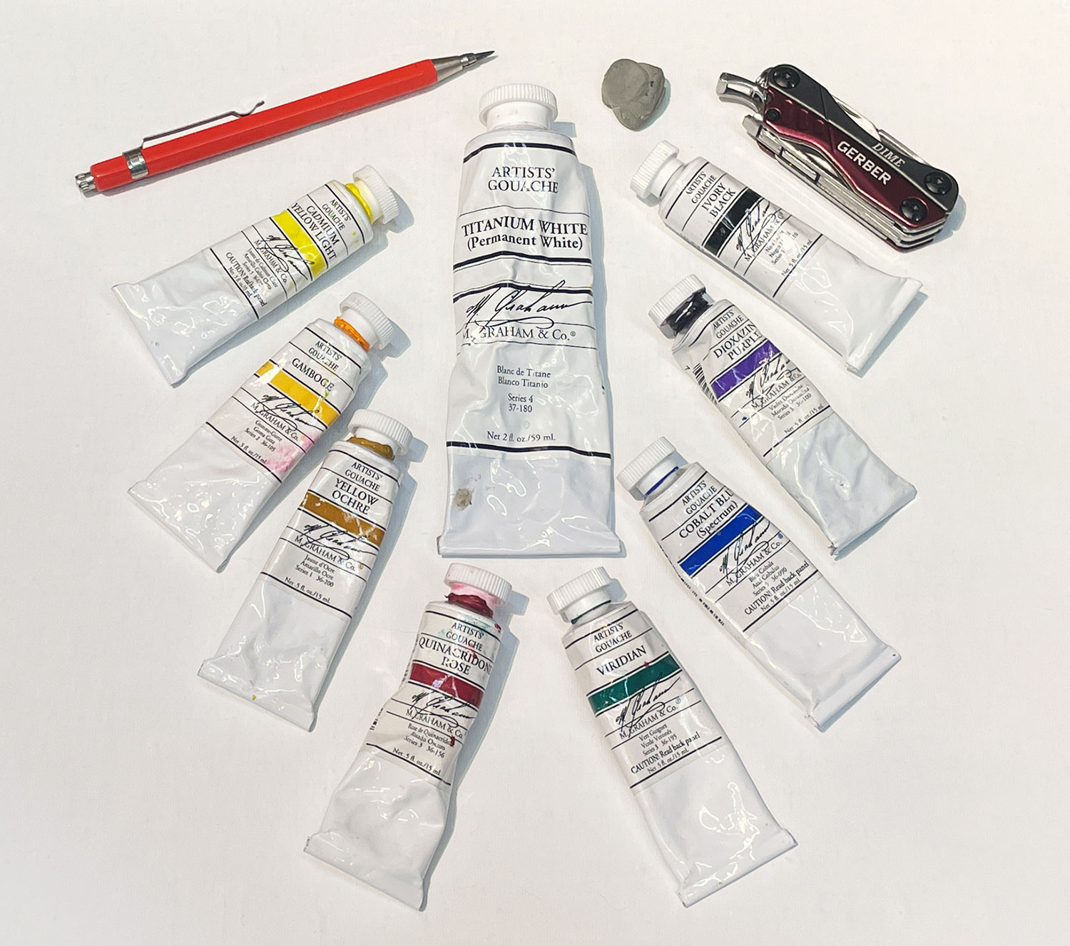 - Small pouch with 9 tubes of M. Graham & Co. gouache paint, a pencil, a kneaded eraser, and a small multi-tool for opening paint tubes, etc. (see next photo for contents of this pouch)