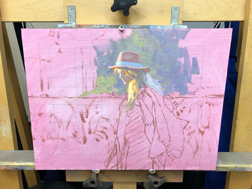 A better approach I’ve found for myself with larger canvases is to start painting in a particular area (usually the center of interest) and work outward, finishing as I go. (See this example.) It takes some definite precision and care to make correct comparisons throughout this process. But in this manner I can stop for a break at any point and let that section dry. (As long as that particular section is complete and I didn’t make mistakes that will need repainting later.) After a break, even an extended one, I can pick up where I left off and work on the next section, continuing to complete areas as I go. When the canvas is fully covered, the painting is finished unless any corrections need to be made anywhere. It can be difficult to properly judge colors and values before the canvas is all filled in, but that’s part of the learning curve of this method of working outward.