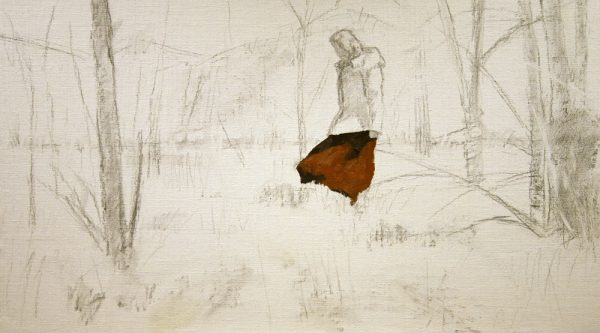 I start adding details to the trees and grasses, taking care that they don’t become too interesting in comparison with Sarah. After all, she’s the most important element in the scene.